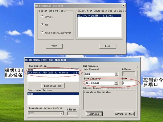 一切看起來都是那麼的順利,但是當我們通過串口進行Test Packet命令下發之後在兩個主機接口卻看不到信號波形出現。因為是第一次進行嵌入式USBdeceshi,suoyiduiyuchuxiandewentishimeiyourenhejingyankeyicankaohejiejiande。congchuankouxinxilaikanshixianshiminglingxiafachenggongde,nawentidaodichuzainaline?zhiyoucongxinhaoliuxiangyibuyibudizhazhaole。gongchengshishouxianceshileUSB HUB與CPU之間的Upstream接口,發現有相應的信號波形出現。也就是說USB主機控製器已經執行了Test Packet命令並發送了測試碼流,問題出現在了USB Hub這裏,它並沒有向兩個Down Stream Facing Port轉發碼流。而且原廠提供的命令也很奇怪,根據有PC主板測試經驗的工程師的意見,對於HUB的測試應該需要指定測試端口才對。而在測試命令中我們並沒有看到相應的指令而隻有簡單的Test Packet命令。在詢問了原廠技術人員後問題有了答案: