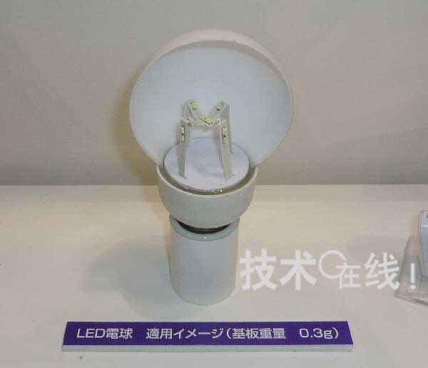 作為應用立體布線的例子,Mectron還展出了LED燈泡的試製品。通過在立體底板上封裝朝向多個方向的LED模塊,可以擴大光照射範圍。如果在布線層之外再加上散熱用厚銅箔,則LED模塊散熱也會變得很容易。