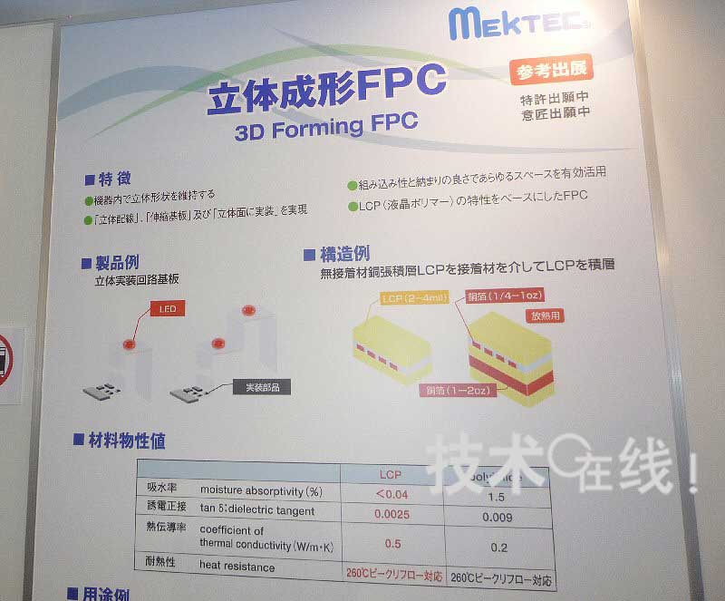 日本Mectron可立體成型的柔性底板“立體成型FPC”在“JPCA Show 2010”(2010年6月2~4日)上參考展出。該底板由熱可塑性液晶聚合物和銅箔構成,形成希望的構造並加熱後冷卻,可以保持其形狀。預定在2010年度內完成技術開發,2011年度開始量產。