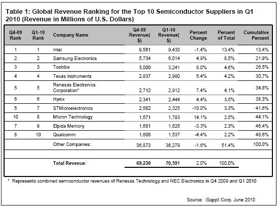 在全球排名前10的半導體供應商中,2010年第一季度有六家銷售收入高於2009年第四季度。表1所示為iSuppli公司對2010的第一季度全球10大半導體供應商的排名。