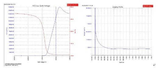 圖5.利用吉時利4200-SCS進行參數提取的實例表現了半導體的摻雜特征(左邊的藍線),它與1/C2與Vg的關係呈倒數關係(紅線)。右圖給出了摻雜分布,即每立方厘米的載流子數與襯底深度的函數關係。