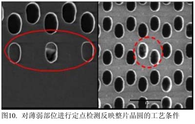 最zui終zhong的de實shi驗yan證zheng明ming自zi動dong工gong藝yi檢jian測ce結jie果guo與yu最zui終zhong良liang率lv的de對dui應ying關guan係xi。表biao明ming自zi動dong工gong藝yi檢jian測ce可ke以yi反fan映ying存cun儲chu單dan元yuan內nei接jie觸chu孔kong通tong孔kong刻ke蝕shi的de狀zhuang態tai。對dui於yu在zai生sheng產chan線xian上shang檢jian驗yan到dao薄bo弱ruo部bu位wei有you刻ke蝕shi不bu完wan全quan比bi較jiao多duo的de晶jing圓yuan,其qi對dui應ying的de正zheng常chang存cun儲chu單dan元yuan內nei也ye有you較jiao多duo的de接jie觸chu孔kong有you刻ke蝕shi不bu完wan全quan問wen題ti。可ke以yi通tong過guo對dui產chan品pin的de薄bo弱ruo部bu位wei進jin行xing監jian測ce達da到dao對dui正zheng常chang存cun儲chu單dan元yuan內nei接jie觸chu孔kong刻ke蝕shi狀zhuang態tai的de實shi時shi反fan映ying,這zhe對dui接jie觸chu孔kong的de刻ke蝕shi工gong藝yi改gai進jin有you極ji大da的de促cu進jin作zuo用yong(如圖11所示)。