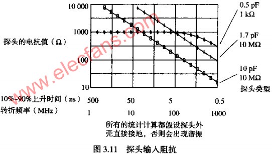 參見圖3.11,在我們關注的上升時間範圍內,探頭的並聯電容越高,阻抗會越低。在高頻時,隻有並聯電容比較重要。