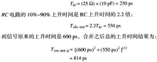 如第三個波形所示,當連接的串聯電感很小時,探頭等效於一個簡單的電容負載。圖3.12所示的測試點等效信號源端阻抗為25歐,當耦合到10PF的容性負載時,其RC上升時間是: