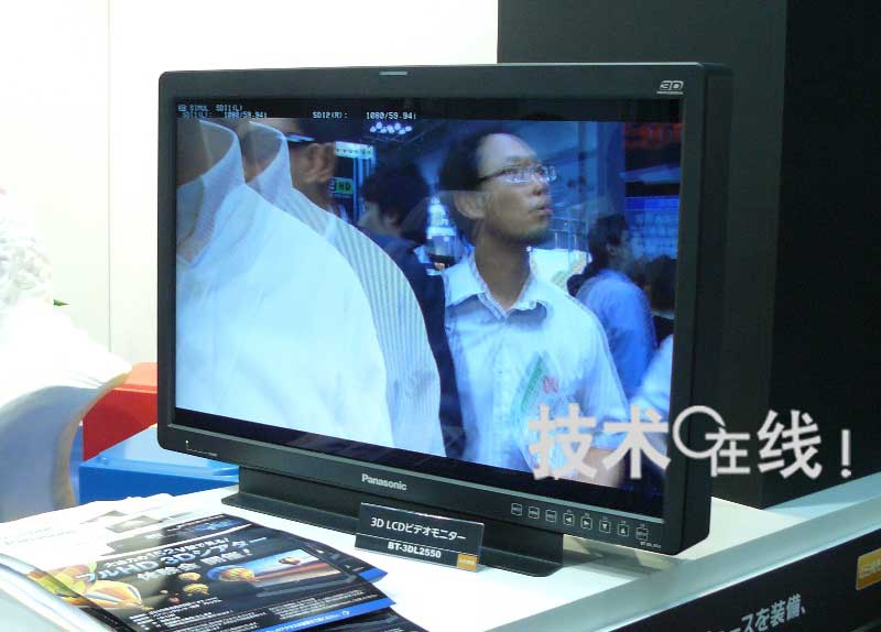 鬆下的3D液晶顯示器畫麵尺寸為25.5英寸,像素為1920×1200。預定近期上市,價格為100萬8000日元。支持隔行交互配置左眼及右眼用影像信號的“Line-By-Line方式”、分兩條信號線發送左眼及右眼用影像信號的“Simul方式”、以及將左眼及右眼用影像信號隻在水平方向壓縮至1/2左右配置的“Side-By-Side方式”。預定2010年秋季上市采用120Hz驅動PDP及液晶快門配備型眼鏡、支持“Frame Sequencial方式”的3D顯示器。