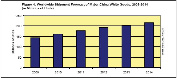 冰箱、空調和洗衣機的出貨量2010年將達到1.615億台,比去年的1.434億增長12.6%。這些產品是中國白色家電市場的關鍵組成部分。“白色家電”源於最初這類產品都是白色外觀,但現在也采用其它顏色。iSuppli公司追蹤的其它中國白色家電包括微波爐和電磁爐。