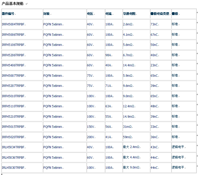 新的功率MOSFET采用了IR最新的矽技術來實現基準性能,適用於網絡和電信設備的DC-DC轉換器、AC-DC開關電源(SMPS)及電機驅動開關等開關應用。由於新器件滿足40V到250V的寬泛電壓,所以可提供不同水平的導通電阻(RDS(on))和柵極電荷(Qg),為客戶的特定應用提供優化的性能和更低成本。