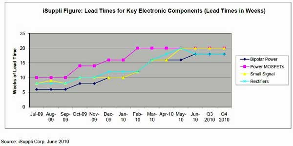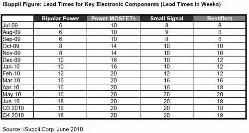 iSuppli指出,整體市場的交貨期比一個月以前所預期的拉長很多;例如功率 MOSFET 與小型訊號晶體管的交貨期在6月時約20周,雙極功率組件(bipolar Power devices)與整流器的交貨期則為18周;而在正常情況下,這些零組件的交貨期應該是10~12周。