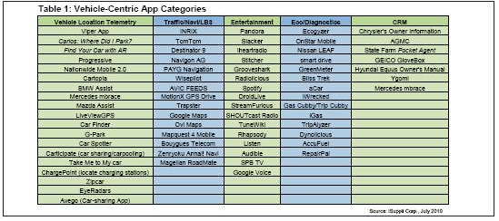 所有這些已導致智能手機和應用程序在汽車中的重要性上升。因此,iSuppli公司已開始更加密切地關注日益增多的以汽車為中心的應用程序,並把它們歸結為五大類: