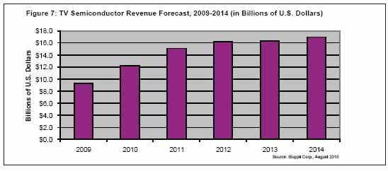 2009年電視半導體銷售額高達93億美元,由於液晶電視需要更多的半導體芯片支持各種高級功能,2010年銷售額有望更上層樓。iSuppli公司的預測顯示,2010年電視半導體市場將達到121億美元。