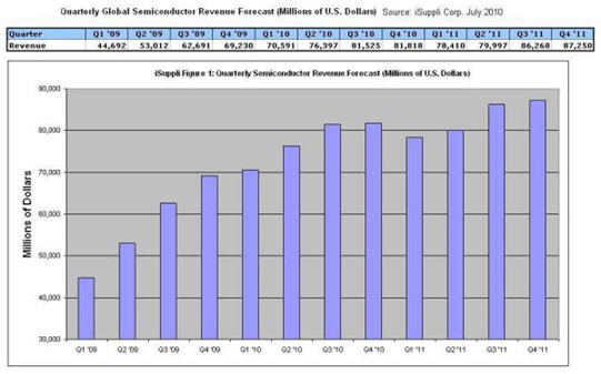 由於市場需求迅速的增長,2010全球半導體市場如注入強心劑一樣,促使iSuppli再次提升銷售額的預測至創記錄的水平。如下圖所示;