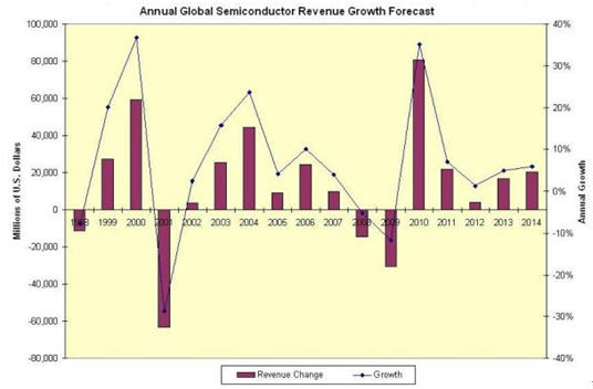 當2010年的增長與2000年相比時,要清楚此波周期的性質與2000年時有明顯的不同,這是十分重要的。2000年的增長是由於1999年的產能迅速擴充以及不能持久的網絡泡沫增長來推動,所以2001年泡沫破裂,導致半導體業下降28.6%。相比2010年的增長是由於受2009年的外力突然打擊,產業自身增長的動力暫時被壓抑,因而在2010年半導體產業能迅速回複,包括在2011年能繼續增長。