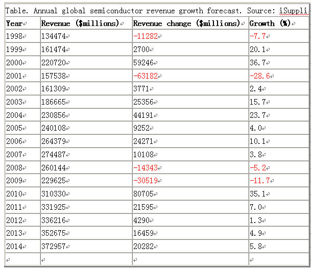 下表是自1998年至2014年的半導體年銷售額與增加值及增長率的數據,包括預測;
