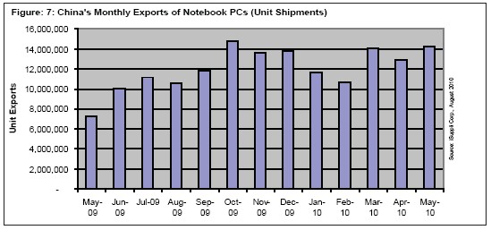 據iSuppli公司,由於第二季度全球對筆記本電腦的需求強勁,中國5月筆記本電腦出口量創下紀錄高位,幾乎是2009年5月的兩倍。
