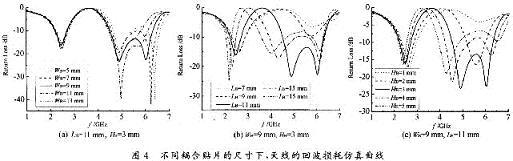 圖4(b)顯示了耦合貼片長度(LB)分別取7mm,9mm,11mm,13mm和15mm時shi,天tian線xian的de回hui波bo損sun耗hao仿fang真zhen曲qu線xian。隨sui著zhe耦ou合he貼tie片pian長chang度du的de增zeng加jia,天tian線xian的de最zui低di諧xie振zhen模mo式shi向xiang低di頻pin移yi動dong,同tong時shi匹pi配pei特te性xing變bian好hao,但dan是shi阻zu抗kang帶dai寬kuan減jian小xiao。對dui於yu高gao頻pin段duan,當dangLB的取值小於9mm時,耦合貼片產生的諧振模式並沒有出現,出現這種情況的原因可能是由於耦合貼片產生的諧振模式與本征高次模式重合。隨著LB繼續增加,耦合貼片產生的諧振模式出現並向低頻方向移動,同時高頻段的兩個模式漸漸遠離。