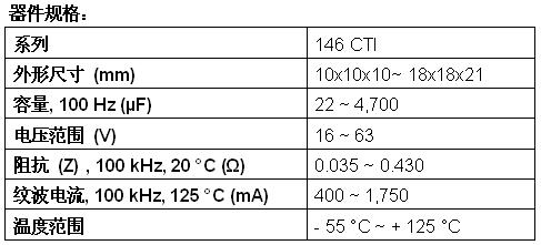新款146 CTI電容器具有最苛刻的回流焊曲線,提供從10mmx10mmx10mm至更大的18mmx18mmx21mm的8種外形尺寸。今天發布的器件的高溫性能達+125℃,在100kHz和+20℃條件下的阻抗為0.035Ω~0.430Ω,在100kHz和+125℃條件下的紋波電流為400mA~1750mA,在+125℃下的使用壽命長達6000小時。