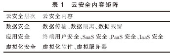 雲(yun)安(an)全(quan)架(jia)構(gou)的(de)一(yi)個(ge)關(guan)鍵(jian)特(te)點(dian)是(shi)雲(yun)服(fu)務(wu)提(ti)供(gong)商(shang)所(suo)在(zai)的(de)等(deng)級(ji)越(yue)低(di),雲(yun)服(fu)務(wu)用(yong)戶(hu)自(zi)己(ji)所(suo)要(yao)承(cheng)擔(dan)的(de)安(an)全(quan)能(neng)力(li)和(he)管(guan)理(li)職(zhi)責(ze)就(jiu)越(yue)多(duo)。下(xia)麵(mian)對(dui)雲(yun)計(ji)算(suan)安(an)全(quan)領(ling)域(yu)中(zhong)的(de)數(shu)據(ju)安(an)全(quan)、應用安全和虛擬化安全等問題(見表1)的應對策略和技術進行重點闡述。