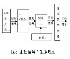 采用DDS技術在當前的測試測量行業已是一種主流的做法,其頻率精度可隨相位累加器的位數而定。本係統采用單片機+專用DDS芯片的方式產生正弦信號,其原理如圖4所示,ARM單片機向CPLD 發出控製命令,CPLD 在時鍾下譯碼後產生DDS的控製信號,產生出相應頻率的正弦波信號,該正弦信號經過濾波放大後,輸出相應幅值的正弦信號。