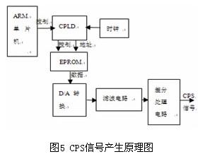 曲軸位置信號(CPS)是PCM控製點火係統中最主要的傳感器信號,為適應多種PCM的需求,設計采用CPLD和DA的方式產生。CPS信號產生原理如圖5所示,在EPROM中存有一個周期的正弦表數據,當需要產生 CPS信號時,ARM單片機對CPLD進行設置,CPLD根據接收的控製命令,通過時鍾計數,產生讀存儲器的信號,並向EPROM提供合適的地址信號和控製信號,EPROM輸出相應地址的數據,經D/A轉換,變成單端CPS模擬信號,然後經濾波電路和單端轉差分處理電路,輸出CPS差分信號。在實際的電路實現中,對CPS信號的控製可由計算機通過CAN總線向ARM發出控製命令進行設置,因此,即使ARM芯片在運行過程中複位,電路仍能輸出正確的CPS信號,以確保測試周期的正常進行。