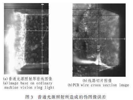 從圖中可以清晰地看到,目前的普通光源攝取的圖像和真實的截麵圖有明顯的邊緣偏差,在2X的倍率下,1像素對應的物麵尺寸為1.61μm。偽圖像邊緣造成的線寬差別超過3像xiang素su。使shi得de係xi統tong準zhun確que度du大da為wei降jiang低di。該gai偽wei圖tu像xiang邊bian緣yuan產chan生sheng的de原yuan因yin是shi由you於yu普pu通tong光guang源yuan光guang線xian照zhao射she角jiao度du過guo小xiao。被bei厚hou密mi線xian路lu遮zhe擋dang大da部bu分fen光guang線xian後hou,基ji材cai和he下xia線xian寬kuan的de亮liang度du和he顏yan色se非fei常chang接jie近jin。而er一yi般ban的de線xian寬kuan測ce試shi中zhong,並bing沒mei有you將jiang該gai偏pian差cha計ji入ru測ce量liang結jie果guo。致zhi使shi測ce量liang值zhi產chan生sheng一yi個ge固gu有you方fang向xiang的de係xi統tong誤wu差cha,也ye就jiu是shi說shuo,如ru果guo該gai誤wu差cha不bu能neng被bei消xiao除chu,所suo測ce得de的de數shu據ju不bu是shi真zhen實shiPCB的線路特征的反映。而該誤差並不能通過改變圖像的清晰程度和對比度消除,隻能依據PCB厚密線路的特點去改變光源的設計來消除或減小該誤差。