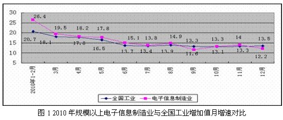 1、在工業中保持領先地位。2010年,電子信息製造業增加值、利潤、投資增速分別高於工業平均水平1.2、4.3、21.7個百分點。規模以 上電子信息製造業收入、從業人員占全國工業比重達9.1%、9.7%,電子信息產品出口占全國出口的比重達37.5%,國民經濟支柱性產業地位日趨突出。
