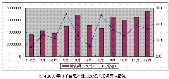 電子信息產業結構調整步伐加快。2010年,電子元器件行業銷售產值分別增長29.4%和39%,出口交貨值增長26.2%和41.7%,利潤 增長61%和207.4%,成為拉動全行業增長的主要力量;軟件產業保持31%的速度增長,占電子信息產業的比重達到18%。產業鏈不斷向上延伸,多條 12英寸集成電路生產線建成投產,與發達國家差距逐步縮小;多條液晶麵板生產線已投產,彌補了高世代生產線的空白。