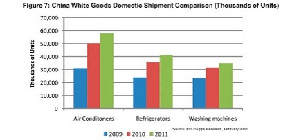 中國政府2010年旨在刺激本地消費的補貼計劃,非常成功地刺激了中國白色家電市場。據IHS iSuppli公司的研究,2011年繼續實施補貼計劃將推動白色家電市場進一步增長。