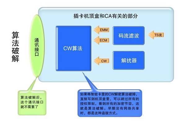 圖六是傳統CA的破解步驟,隻要解加密的CW算法被攻破,整個CA就算完了,就可以在此基礎上完成圖二中的算法破解和圖四、圖五中的網絡共享。