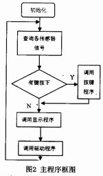 主程序的主要功能是循環調用顯示子程序、按鍵子程序,查詢各輸入信號狀態,根據按鍵設定的各種參數和各輸入信號狀態控製各執行機構,完成對PCB周轉箱托架係統的傳動控製,以及對PCB板的有序傳送,判別係統運行狀態是否異常,並及時報警或解除報警。主程序框圖如圖2所示。