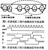qudongzichengxuzhuyaofuzeshengchengbujindianjiqudongqisuoxuyaodexinhao。dangshangxingjianhuoxiaxingjiananxia,huozhegenjuzhuchengxuyunxingjieguo,xuyaotishenghuojiangluozhouzhuanxiangtuojia,zhuchengxuhuitiaoyongbujindianjiqudongzichengxu。bujindianjicaiyongsanxiangliupaigongzuofangshi,genjusigangfuluowenjianju,jisuanchubujindianjimeibujincheng,zaigenjuzhouzhuanxiangbanjianju,quedingbutonggongkuangxia,bujindianjidezheng/反轉步數,這些步數保存在各相應存貯器裏,供主程序調用驅動子程序時使用。圖3和圖4分別為步進電機三相六拍工作方式時驅動信號的狀態圖和時序圖。