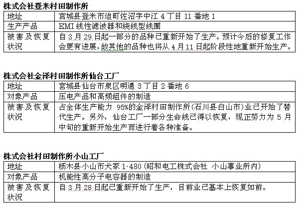 村田株式會社關於三個受災工廠的恢複情況