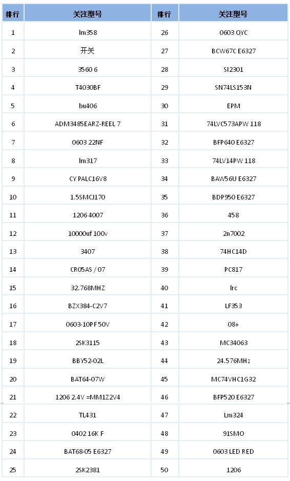 您知道在過去的一周,各商家都在關注哪些型號的IC產品嗎?哪些產品關注度最高呢?根據過去一周的情況,總結出商家最關注IC型號排行榜top50,這將有助於大家研究市場趨勢,排名如下: