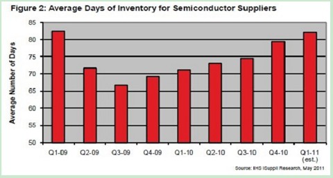 現在看來,廠商在2010年第四季度到2011年第一季度這段淡季時期增加庫存實屬幸運,因為它為原材料、在加工產品和產成品創造了2-4周的緩衝。IHS公司認為,日本災害發生在3月11日,屬於第一季度末段,因此第一季度供應鏈受到直接衝擊的時間有限。