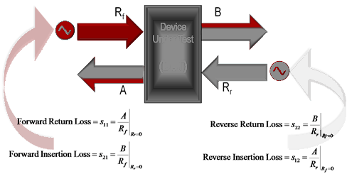S11定義為端口1反射的能量占端口1入射信號的比例,S21定義為傳輸到DUT端口2 的能量占端口1入射信號的比例。參數S11和S21為前向S-參數,這是因為入射信號來自端口1的射頻源。對於從端口2入射信號,S22為端口2反射的能量占端口2入射信號的比例,S12為傳輸到DUT端口1的能量占端口2入射信號的比例。它們都是反向S-參數。