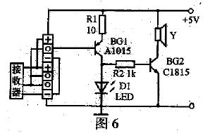 紅外線遙控接收器和紅外線遙控發射器的檢測電路如圖6所示。圖中Y是直徑為1cm,高為1cm左右的圓柱形小體積蜂鳴器,插孔的標號“+”、“-”表示遙控接收器的電源端,“o”表示遙控接收器的信號輸出端。若檢測一體化的三端紅外線遙控接收器,將被測遙控接收器的3隻引腳插入對應的插孔中,接通電源,用一隻好的紅外線遙控發射器對著遙控接收器,按住遙控發射器的任意按鍵時,若D1能閃爍發光,同時蜂鳴器Y發fa聲sheng,則ze被bei測ce紅hong外wai線xian遙yao控kong接jie收shou器qi是shi好hao的de。若ruo要yao檢jian測ce紅hong外wai線xian遙yao控kong發fa射she器qi的de好hao壞huai,要yao將jiang一yi隻zhi好hao的de紅hong外wai線xian遙yao控kong接jie收shou器qi插cha入ru插cha座zuo中zhong,按an下xia被bei測ce紅hong外wai線xian發fa射she器qi的de任ren何he按an鍵jian時shi,發fa光guang二er極ji管guanD1都能閃爍發光,同時蜂鳴器發聲,則被測紅外線遙控發射器是好的。