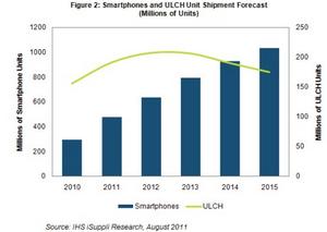 下圖所示為2010-2015年智能手機與ULCH單位出貨量預測。