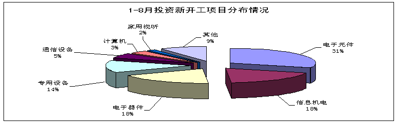 1-8月,電子信息產業500萬元以上項目完成固定資產投資5602億元,同比增長67.7%,高於工業投資41.1個百分點,增速是去年同期兩倍多。分月來看,前8個月(除6月份稍有回落)月投資增速均60%以上,其中8月份完成投資795.5億元,同比增長70.8%,增速比7月提高5.6個百分點。