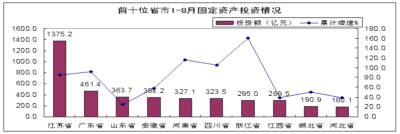 前8個月,東部地區完成投資3558億元,同比增長75.9%,增速高於去年同期33.6個百分點;江蘇、廣東、浙江、北京投資上升較快,增速超過80%,特別是江蘇省完成投資1375億元,占全國總投資的四分之一。中部地區完成投資1472億元,同比增長58.4%,其中河南投資增長較快,增速均超100%。西部地區投資慢於中東部,完成投資572億元,同比增長47.2%,其中四川省投資323.5億元,占西部地區的57%,同比增長105%。