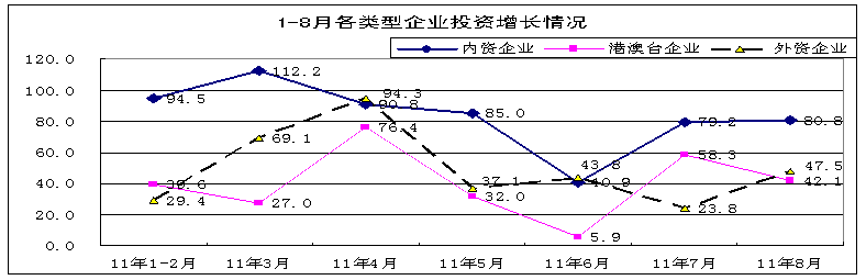 1-8月,內資企業完成投資4152億元,占全行業投資的74%,同比增長78.9%,高於全行業11.2個百分點,其中私營企業增勢突出,同比增長達114%。港澳台企業完成投資605億元,同比增長38.4%,低於全行業29.3個百分點。外商投資企業完成投資845億元,同比增長45.3%。