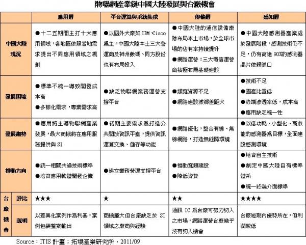 感gan知zhi層ceng一yi直zhi以yi來lai都dou是shi台tai廠chang之zhi強qiang項xiang,加jia上shang中zhong國guo大da陸lu目mu前qian技ji術shu較jiao為wei薄bo弱ruo,短duan期qi台tai灣wan感gan測ce芯xin片pian廠chang具ju有you較jiao大da之zhi優you勢shi。應ying用yong部bu分fen,智zhi能neng電dian網wang與yu智zhi能neng醫yi療liao在zai中zhong國guo大da陸lu將jiang是shi最zui大da的de應ying用yong領ling域yu與yu投tou資zi方fang向xiang。但dan由you於yu物wu聯lian網wang應ying用yong範fan圍wei廣guang大da,涉she及ji各ge個ge層ceng麵mian,資zi源yuan難nan以yi集ji中zhong發fa展zhan,台tai廠chang可ke藉ji由you差cha異yi化hua案an例li作zuo為wei利li基ji,將jiang解jie決jue方fang案an包bao裝zhuang後hou整zheng案an輸shu出chu。例li如ru,台tai灣wan目mu前qian推tui動dong的de智zhi能neng生sheng活huo計ji畫hua,所suo積ji累lei的de物wu聯lian網wang發fa展zhan經jing驗yan及ji成cheng熟shu技ji術shu,如ru智zhi能neng農nong業ye、智能醫療、智能電表等,都是台廠可藉力使力、搶攻物聯網應用市場的機會。