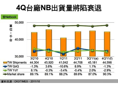 9月部分品牌NB出chu貨huo雖sui見jian回hui溫wen,但dan主zhu因yin是shi庫ku存cun過guo低di回hui補bu,非fei因yin市shi場chang需xu求qiu回hui升sheng所suo致zhi。簡jian佩pei萍ping預yu估gu,第di三san季ji的de低di迷mi市shi況kuang,將jiang延yan續xu至zhi第di四si季ji,年nian成cheng長chang率lv也ye將jiang再zai度du陷xian入ru衰shuai退tui。而er因yin惠hui普pu訂ding單dan從cong偉wei創chuang力li回hui流liu至zhi台tai廠chang,雖sui使shi得de第di四si季ji台tai廠chang占zhan全quan球qiuNB出貨量比重提升至90.3%,但2011年台廠將僅有第三季的NB出貨量年成長率為正。