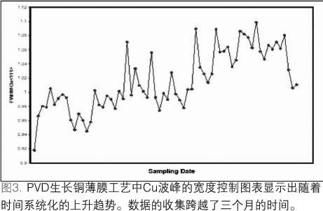 這種設備最初的一種應用是監測一係列物理氣相澱積(PVD)的反應腔,這些反應腔在銅互連金屬化製程中被用來澱積TaN/Ta/Cu襯墊層和籽晶層。這種監測作為標準的平麵電阻,膜厚量測的補充而存在。薄膜堆棧中Ta和Cu成分的織構強度和譜線展寬數據都需要收集。TaN層具有無定形結構,因此無法監測。圖3說明了一個從銅元素峰寬控製圖表中輸出的例子。數據的趨勢穩步向上,表明PVD銅籽晶的平均晶粒大小隨著時間在減小。圖4說明了在相應的Rstubiaozhongleisidanbingbushifenxianzhudezengjia。suihoudeshebeizhenduanfaxianshouyingxiangdefanyingqiangyigefamenyoukongqixieloudexianxiang。xielouyingxiangdaojianshegongyi,jineryingxiangtongzijingcengdedianji,zheyiguochengjiyoukenengshizaidianjihedianjizhihoudezituihuoguochengzhong,youyutongzaiTa表麵的遷移率下降造成。更換了閥門之後,Rs和銅元素峰寬的值都變小,我們從圖3和圖4控製圖表中的最後三個數據點可以看出。