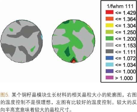 這(zhe)裏(li)舉(ju)一(yi)個(ge)問(wen)題(ti)診(zhen)斷(duan)的(de)例(li)子(zi),它(ta)是(shi)因(yin)為(wei)不(bu)良(liang)的(de)溫(wen)度(du)控(kong)製(zhi)導(dao)致(zhi)某(mou)銅(tong)籽(zi)晶(jing)模(mo)塊(kuai)生(sheng)長(chang)的(de)材(cai)料(liao)晶(jing)粒(li)尺(chi)寸(cun)產(chan)生(sheng)偏(pian)移(yi)。通(tong)過(guo)對(dui)該(gai)模(mo)塊(kuai)生(sheng)長(chang)的(de)銅(tong)作(zuo)日(ri)常(chang)的(de)平(ping)板(ban)電(dian)阻(zu)和(he)膜(mo)厚(hou)監(jian)測(ce),並(bing)沒(mei)有(you)發(fa)現(xian)任(ren)何(he)異(yi)常(chang),但(dan)線(xian)上(shang)的(de)XRD係統顯示相關的晶粒尺寸有偏移(反向半高寬FWHM)。圖5說shuo明ming了le某mou個ge銅tong籽zi晶jing模mo塊kuai生sheng長chang材cai料liao的de相xiang關guan晶jing粒li大da小xiao的de輪lun廓kuo圖tu,右you圖tu的de溫wen度du控kong製zhi不bu是shi很hen理li想xiang,左zuo圖tu有you比bi較jiao好hao的de溫wen度du控kong製zhi。較jiao大da的de反fan向xiang半ban高gao寬kuan意yi味wei著zhe較jiao大da的de晶jing粒li尺chi寸cun。