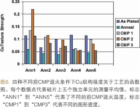 矽片在製程中的三個不同步驟進行測量:電鍍之後,前CMP退火之後,金屬化之後。圖6說明了在M1測ce得de的de銅tong織zhi構gou強qiang度du的de結jie果guo。我wo們men將jiang最zui終zhong結jie果guo作zuo了le平ping均jun,因yin為wei沒mei有you觀guan察cha到dao銅tong微wei結jie構gou在zai矽gui片pian中zhong央yang和he邊bian緣yuan有you任ren何he不bu同tong。從cong數shu據ju中zhong可ke以yi看kan出chu很hen多duo趨qu勢shi,但dan應ying該gai強qiang調tiao的de是shi,微wei結jie構gou的de數shu據ju可ke以yi與yu其qi他ta線xian上shang量liang測ce的de結jie果guo直zhi接jie聯lian係xi起qi來lai,特te別bie是shi矽gui片pian的de良liang率lv。所suo有you的de結jie果guo綜zong合he起qi來lai,可ke以yi選xuan擇ze出chu該gai技ji術shu節jie點dian比bi較jiao優you化hua的de前qianCMP退火條件。