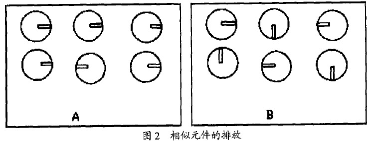 2)相似的元件在板麵上應以相同的方式排放。例如使所有徑向電容的負極朝向板件的右麵,使所有雙列直插封裝(DIP)的缺口標記麵向同一方向等等,這樣可以加快插裝的速度並更易於發現錯誤。如圖2示,由於A板采用了這種方法,所以能很容易地找到反向電容器,而B板查找則需要用較多時間。