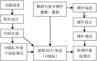 qichedianzichanpinshiruanyingjianjiehedeqianrushixitong。weilejieyueziyuan,suoduanchanpinkaifazhouqi,yibanyingcaiquruanyingjiantongbukaifadefangan。qichedianzichanpindekaifa工具對軟硬件的同步開發、調試提供了很好的支持。汽車電子產品的軟件開發分為功能描述、軟件設計、代碼生成、操作係統環境下高級調試等步驟。汽車電子產品的硬件開發分為硬件描述、硬件設計、硬件調試等步驟。當軟件設計完成後,通過使用相應的工具,完成在虛擬ECU平台上的驗證。當硬件設計完成後,與硬件一起進行軟硬件集成調試。通過這種開發方式,縮短了產品上市的時間。