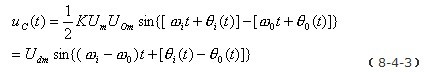 式中的ω0為壓控振蕩器在輸入控製電壓為零或為直流電壓時的振蕩角頻率,稱為電路的固有振蕩角頻率。則模擬乘法器的輸出電壓uD為:
