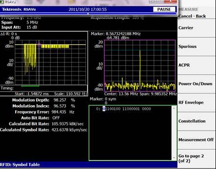 使用ASK調製方式的RFID係統是通過副載波傳輸數據信息的。在上圖的頻譜部分,我們可以清楚地看到射頻信號的載波是13.56MHz,副載波信號為±800KHz左右。符合相關規定的要求。如果需要測量射頻信號的射頻參數,如信道功率、鄰道功率比或占用帶寬等,通過選擇MDO4000的自動測量功能,可以在屏幕中直接顯示這些測量結果。[page]
