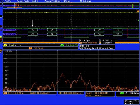 在調試RFID係(xi)統(tong)時(shi),工(gong)程(cheng)師(shi)麵(mian)臨(lin)的(de)一(yi)個(ge)重(zhong)要(yao)的(de)困(kun)難(nan)是(shi)如(ru)何(he)測(ce)量(liang)標(biao)簽(qian)的(de)返(fan)回(hui)信(xin)號(hao)。由(you)於(yu)標(biao)簽(qian)返(fan)回(hui)信(xin)號(hao)的(de)幅(fu)度(du)很(hen)小(xiao),使(shi)用(yong)普(pu)通(tong)的(de)示(shi)波(bo)器(qi)往(wang)往(wang)難(nan)以(yi)捕(bu)獲(huo)這(zhe)一(yi)信(xin)號(hao),更(geng)不(bu)要(yao)說(shuo)對(dui)其(qi)幅(fu)度(du)和(he)頻(pin)率(lv)做(zuo)進(jin)一(yi)步(bu)分(fen)析(xi)了(le)。主(zhu)要(yao)原(yuan)因(yin)是(shi)普(pu)通(tong)示(shi)波(bo)器(qi)的(de)動(dong)態(tai)範(fan)圍(wei)隻(zhi)有(you)40dB,無法捕獲微弱的標簽信號。MDO4000具有60dB的動態範圍,以及低至-152dB/Hz 的底噪,能夠很好地勝任同時捕獲讀寫器信號和標簽信號的任務。其獨特的AvsT射頻信號幅度的時域波形功能,甚至可以顯示標簽信號幅度變化過程。