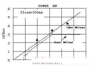 在測試壓差(Dropout)時不同的廠家有不同的標準。德州儀器(TI)電壓差定義為輸出電壓較其標稱值跌落2%時的輸入、輸出電壓的差值.其它的如,美信(Maxim),聖邦微電子(SGMC)電壓差定義為輸出電壓較其標稱值小於100mV時的輸入、輸出電壓的差值. 如圖為聖邦微電子的SGM2007負載為300mA時輸入電壓和輸出電壓的曲線。